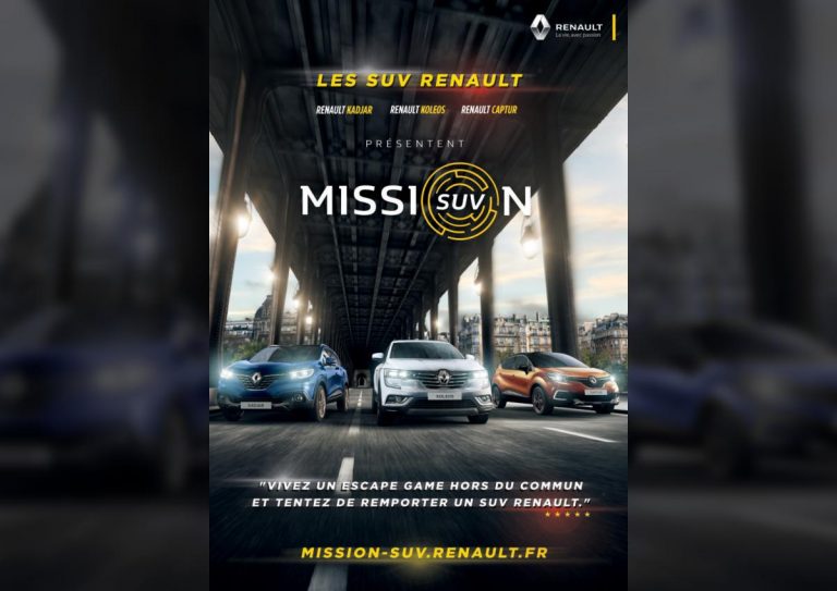 Afin de promouvoir sa gamme SUV Captur, Kadjar et Koleos, Renault a fait appel à l’agence Marcel et à Prizoners pour mettre en place un dispositif expérientiel basé sur le principe d’Escape Game « itinérant ». Déclinée sous la forme de trois scénarios, un par modèle de SUV, la campagne « Mission SUV » immerge les joueurs dans une course contre la montre d’une heure, à l’intérieur même des véhicules parcourant les rues de Paris.
