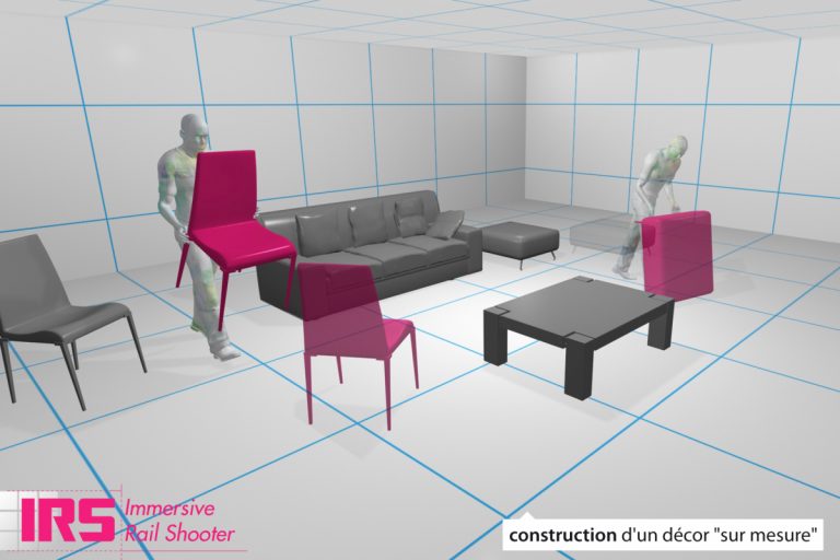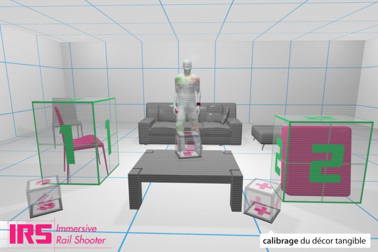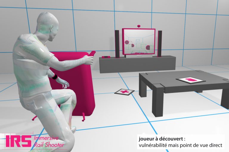 Ayant choisi les rail shooters (jeux de tir sur « rail ») comme « matière première », je me suis focalisé sur les interactions mixtes et la scénarisation du gameplay hors écran. J’ai développé « Immersive Rail Shooter », un jeu qui invite à adopter une gestuelle intégrée en tant que mécanisme propre au jeu.